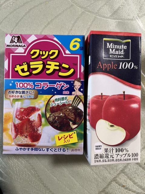 ゼリーにしよう!母にゼラチンを溶かしてもらい(熱湯を使うので)、私と娘でジュースを開けま…娘、ジュース噴射(;▽;)私がリンゴジュースまみれに…(ベタベタ…)