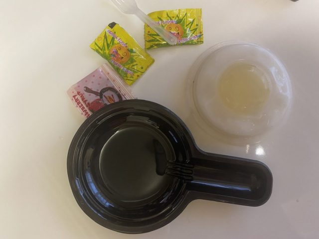 ①付属のプラスチックフライパンにパチパチ飴を入れます。