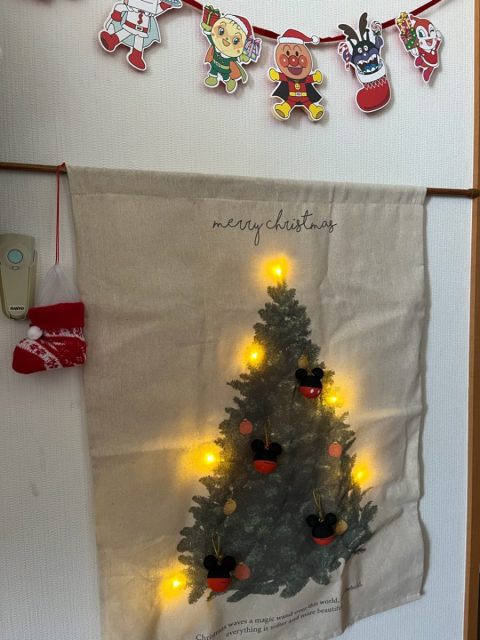 昨年、実家で買いに行ってもらった、タペストリーのクリスマスツリー!ちゃんと光るのがまた最高で…セリアのミッキーのオーナメントをつけて完成!