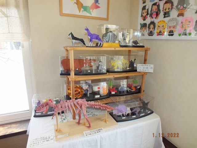 陳列棚や壁・テーブルには、長時間かけて作り上げた力作が勢ぞろい。ハリネズミや昆虫、恐竜、漫画アニメ「鬼滅の刃」のキャラクターなど、大きな一枚の色紙を使って折った大作や大きさの違う折り紙を40枚以上使って丁寧に組み合わせた作品などが所狭しと。