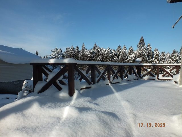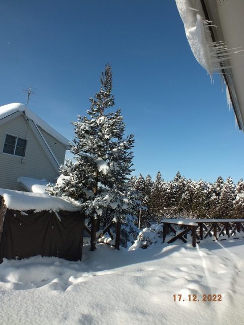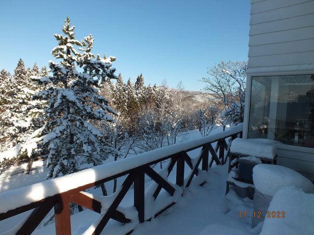 今朝も、玄関前と車道の除雪作業を済ませてから、屋根からの落雪に気をつけながらウッドデッキへ。