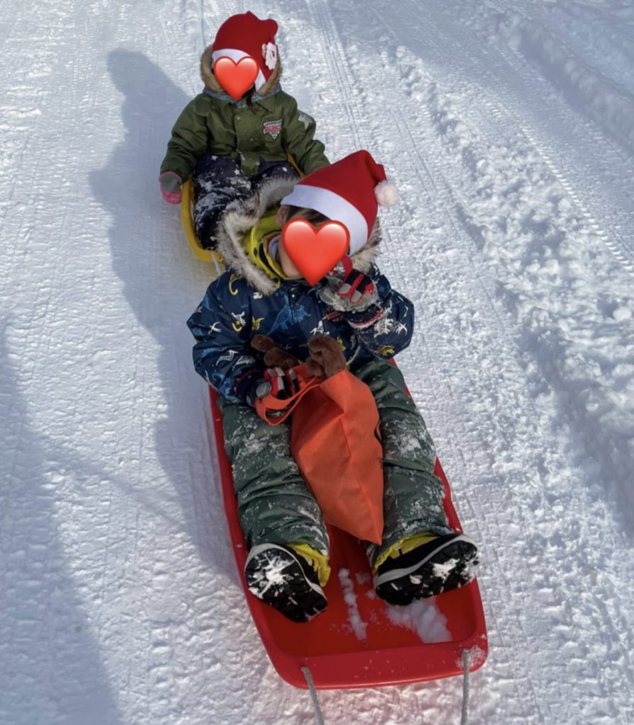 サンタさんの帽子をかぶってソリに乗り、出発!