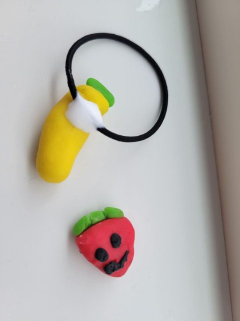 そして兄は粘土で作ったものを固めて、妹がつけるように髪ゴムにする事にハマりだし、かわいい作品を作っています🍓💕