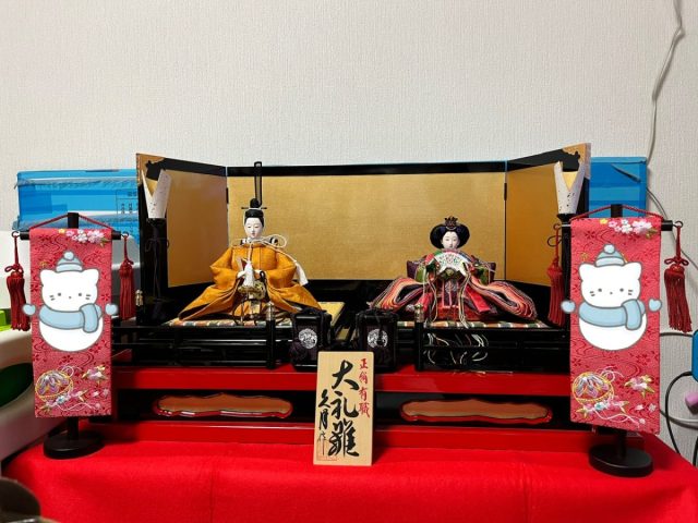 久月で買った時に、飾るタイミングを聞いたら「節分で豆をまいて、家を清めたら大安の日に飾って下さい。」と…大安の日には飾れないけど…休日に出しました。人形は上の子の時に買いましたが、二人目…はて、どうしましょう?って事で名前の旗を買いました。札幌滞在中に久月に行き、函館に戻ってた夫にテレビ電話。二人だし、飾る場所も…って事で小さいのにしました。(本来は屏風の高さに合わせるそうです。)