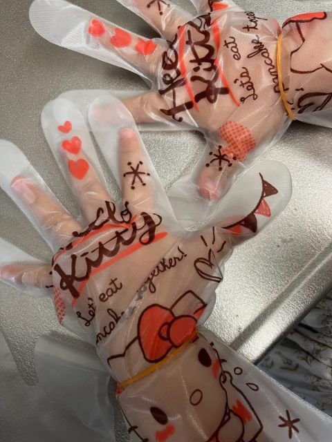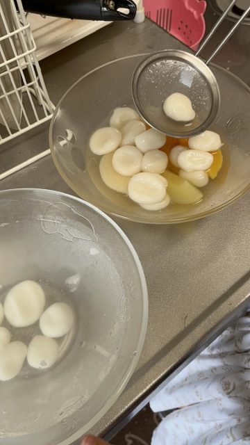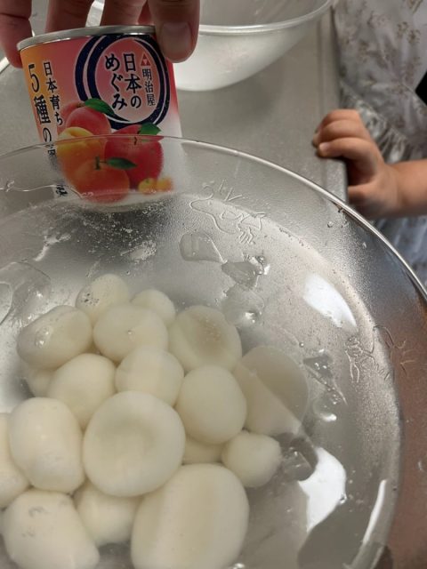 フルーツポンチにするので、白玉作る時に手袋させました!(私がアトピー持ちで、手が荒れてるので挽肉や手で混ぜる物は全て手袋をしてます。)娘は素手でもいいかなぁ〜と思ってたら、ホクレンショップに可愛いお手伝い手袋がぶら下がってて…即購入!
