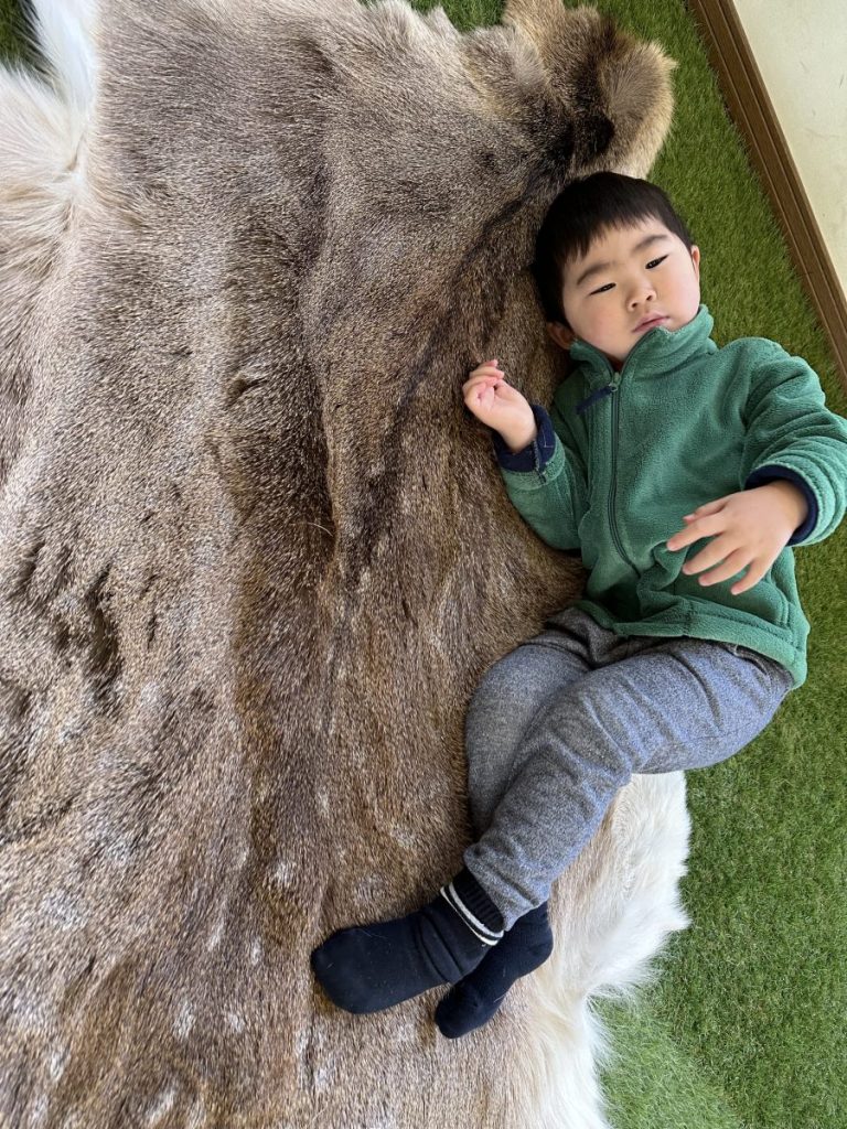 鹿の毛皮だと説明したら、神妙な面持ちで寝転がっていました。笑