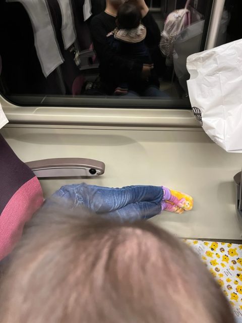 そんなこんな、タブレットやオヤツでどうにかしのぎ…下の子は眠くてグズグズ…チケット振替の時に「多目的トイレ、多目的室が近い車両!」と夫に伝えてたので、車両後方に車椅子用のスペースがあり、そこで立ってたり…上の子も寝たから私も!と思ったら下の子が起き…仕方ない、次は洞爺だから寝たフリ作戦でまた寝てくれ!と薄目で見てたらあくび。よしよし!なーんて思ってたら…