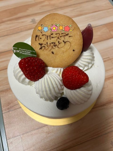 ハーフバースデー当日は函館でしたが、夫がド繁忙期で週末に…当日は姉妹同じようなアングルで写真を撮りました。そして、長女と私達夫婦でケーキも( ´艸`)
