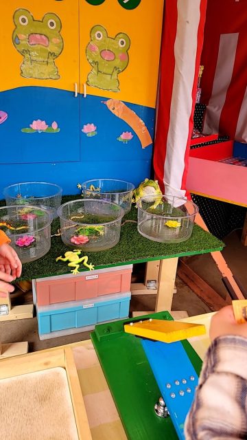 うちの子どもたちが去年ハマっていた「おたまご」とゆう、卵をなげてお玉に入れてビンゴさせる遊びがあったのですが、それがなくなってしまい😭その代わりにカエルを跳ばしてお池に入れてあげる遊びが増えていました🐸🎵