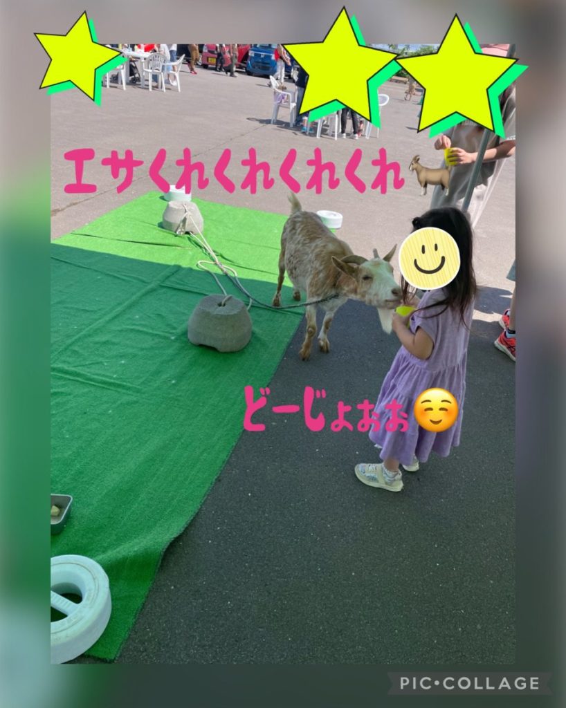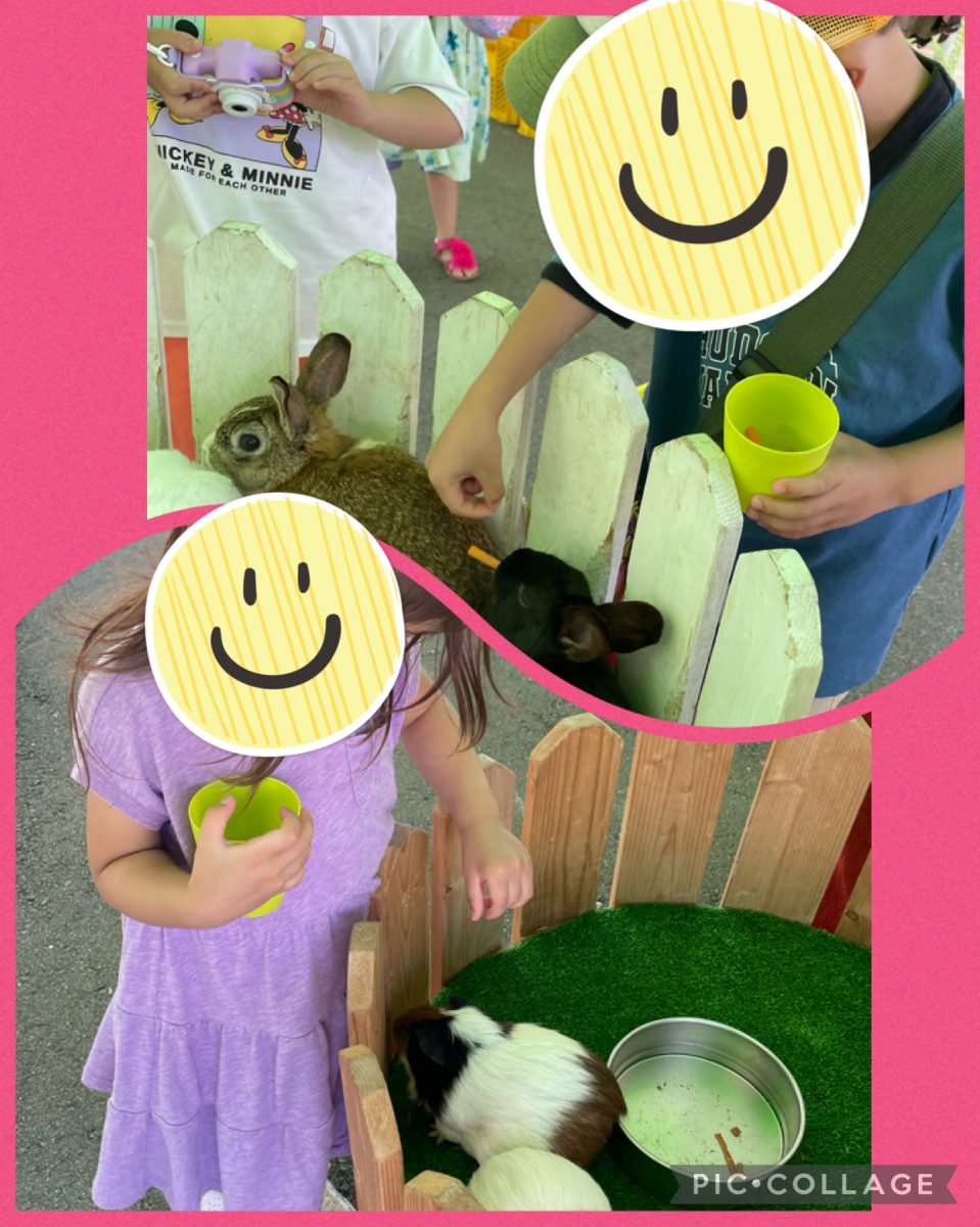上の子は目がハートになりながらうさぎさん、モルモットさんに餌をあげていて、下の子はヤギさんに沢山餌をあげていました。