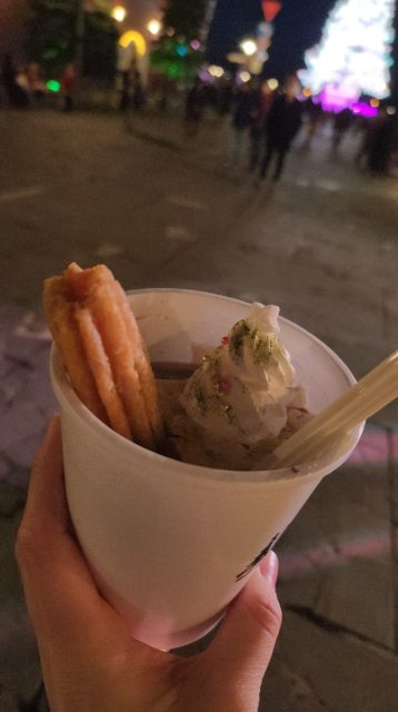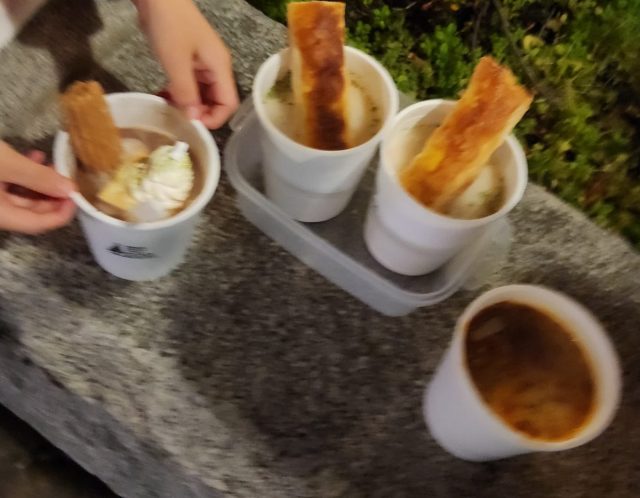 お目当てのスープバーは、去年と同じくパイとチュロスがいい!と言って子どもたちはパイが入ったスープとチュロスの入った甘いチョコのスープを選んでいました☕