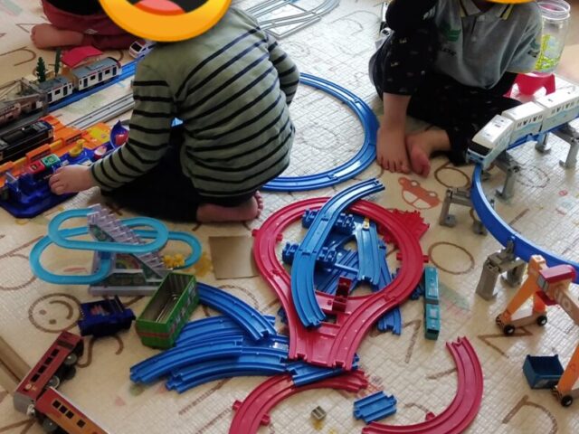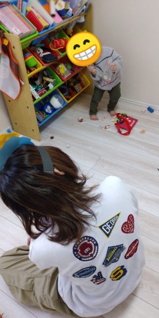 節分を盛り上げる為、豆に見立てた、丸めた折り紙を一生懸命投げ合う大人たち!!そんな大人たちを横目に、我かんせずで、自由に遊びだす長男なのでした。
