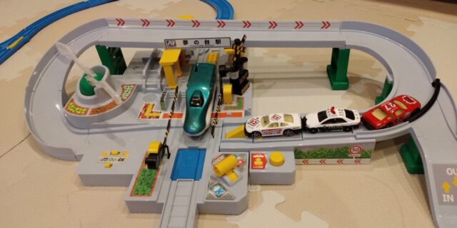まだ、欲しい物を明確に言えないので、プレゼント何にしようか、迷いましたが、踏み切り大好き、プラレールとトミカどちらでも遊べる画期的なこちらのおもちゃに