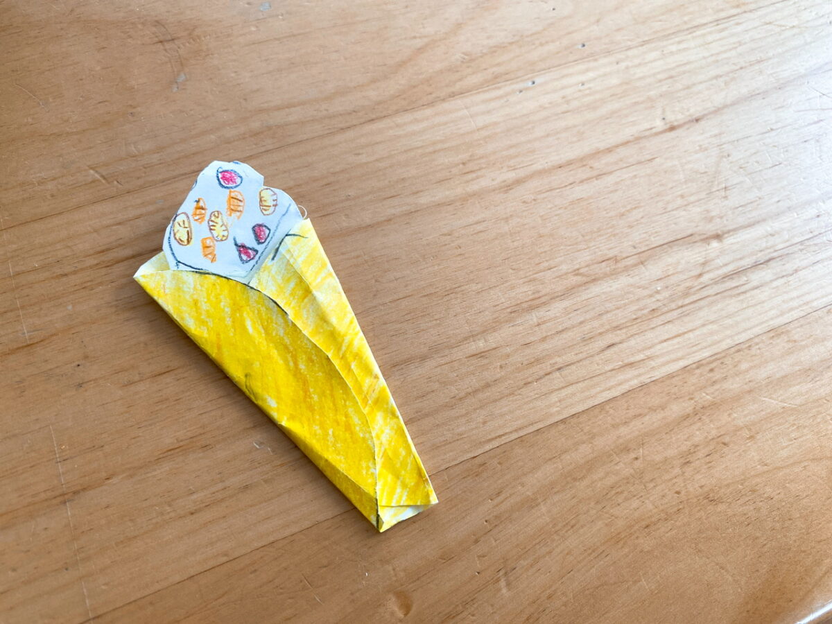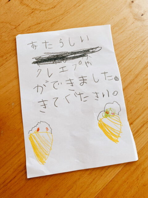 小1娘の書いたビラ、「字すごく上手じゃ~ん♪クレエプじゃなくてクレープだけどね♪」。