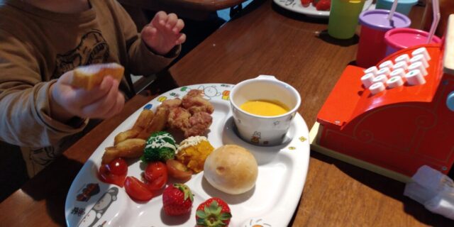 キッズプレートの、にんじんスープが激ウマです!! いちご狩り残念でしたが、キッズプレートのデザートがいちごでした☆やった〜