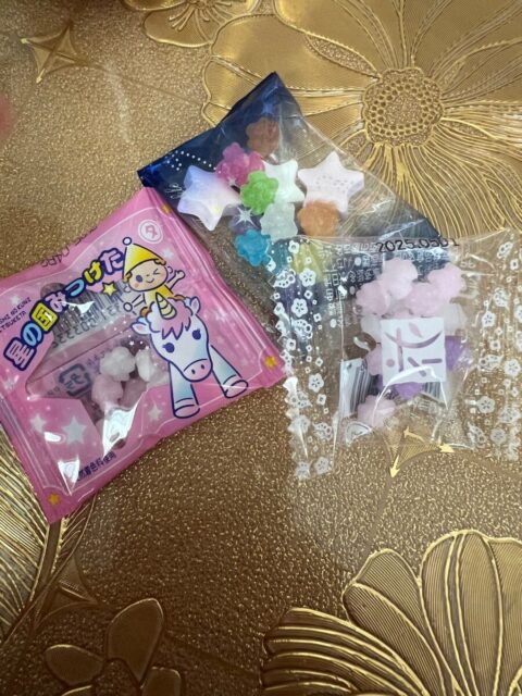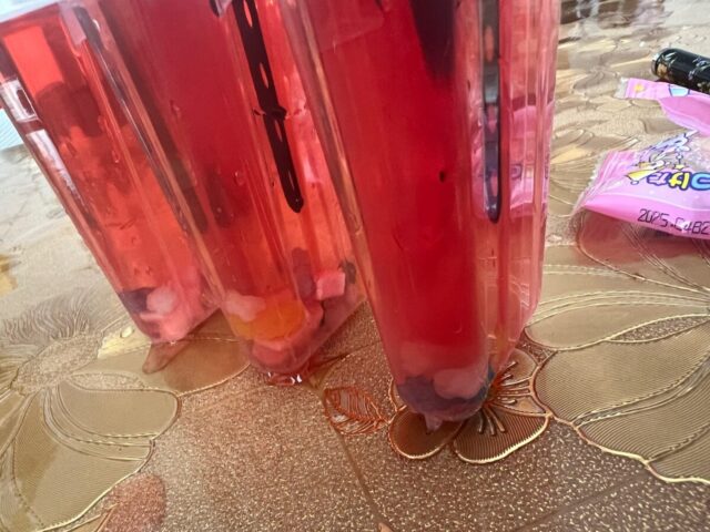 ん?なんか物足りない…あ!スイカの種(チョコ)がないんだ!と思い、チョコを探すも自宅にはなかったので、代わりに七夕でいただいた金平糖とラムネを投入。当たり前に全て沈みました(笑)冷凍して完全に固まる前に埋め込めば、バランスよくトッピングできそうですね♪