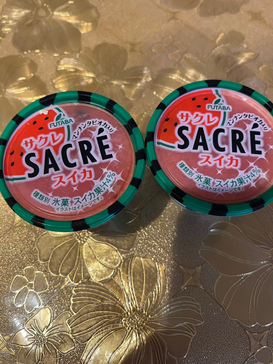 上にレモンスライスが1枚のった定番のレモン味で有名ですが、7月からローソン限定で発売されたスイカ味のサクレ。