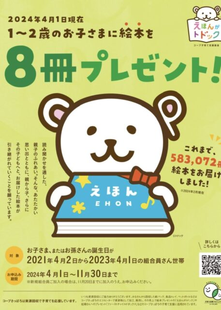 1歳2歳のお子さんがいるご家庭に、コープさんから絵本がなんと無料でプレゼントされるという素敵な企画!しかも8冊も!