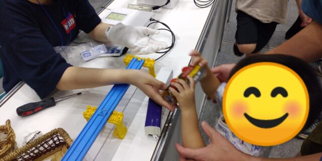 のりのりプラレールでは、写真を撮ってもらい、シールになった写真を先頭に貼ってもらって、運転手さん気分を味わえる先頭車両を作る事が出来ました。