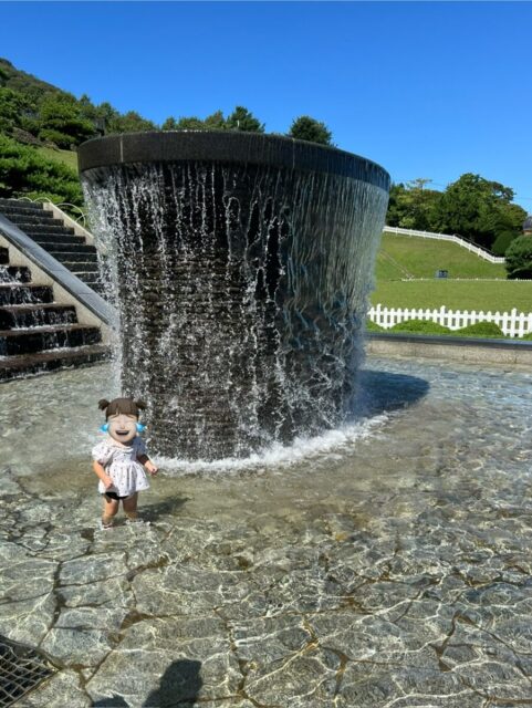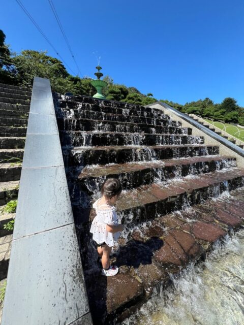 年齢が低い子は下の浅いところで遊べるし、少し大きい子は、階段を登ると少し深い水遊び場と噴水があります。