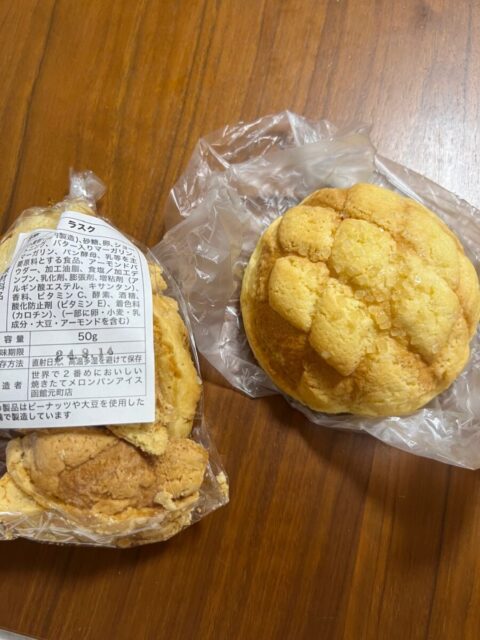 お店が近くなるとバターの香が漂って、食欲そそられます(笑)焼き立てのアツアツメロンパンに冷たいバニラアイスが入っているのですが、この日は30度あったので、急いで食べました♪(写真撮る余裕すらなかったので、お持ち帰りしたメロンパンとラスクの写真を…)