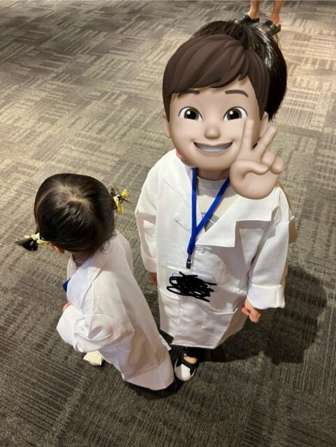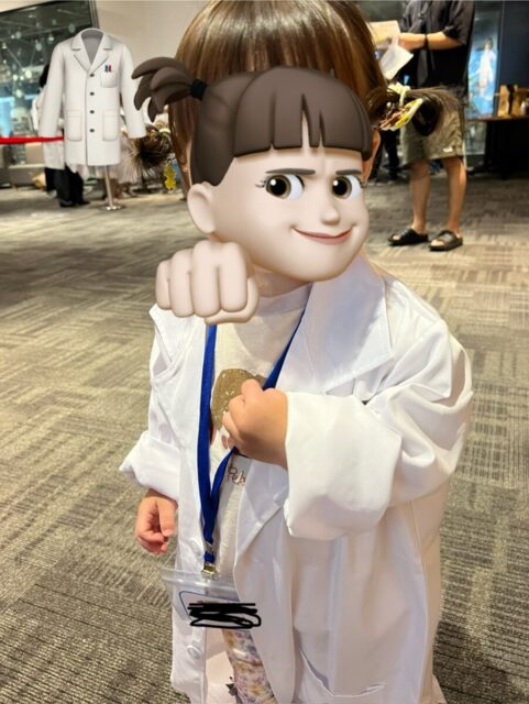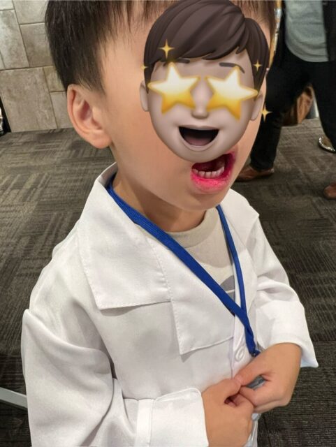 まずは白衣を着て、テンションがあがりました♪(親が)
