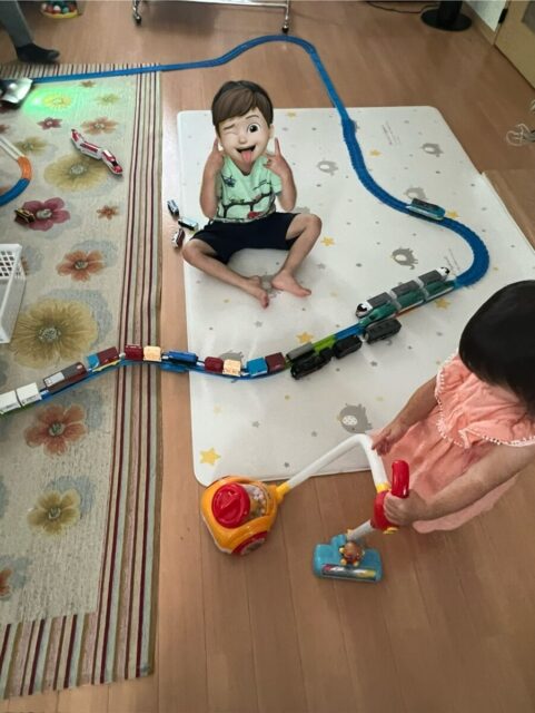 せっかく買ったおもちゃを長く遊んでくれるのは嬉しいことですが、これをやられると掃除機がかけれなくてイライラしている私を見事に娘が再現しています(笑)